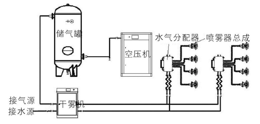 微霧抑塵裝置采用模塊化設計技術。由微霧機/干霧機、螺桿式空氣壓縮機、儲氣罐、噴霧器總成、微霧箱總成/水氣分配器、微霧箱總成控制器、水氣連接管線、電伴熱系統(tǒng)和自動控制系統(tǒng)等組成。